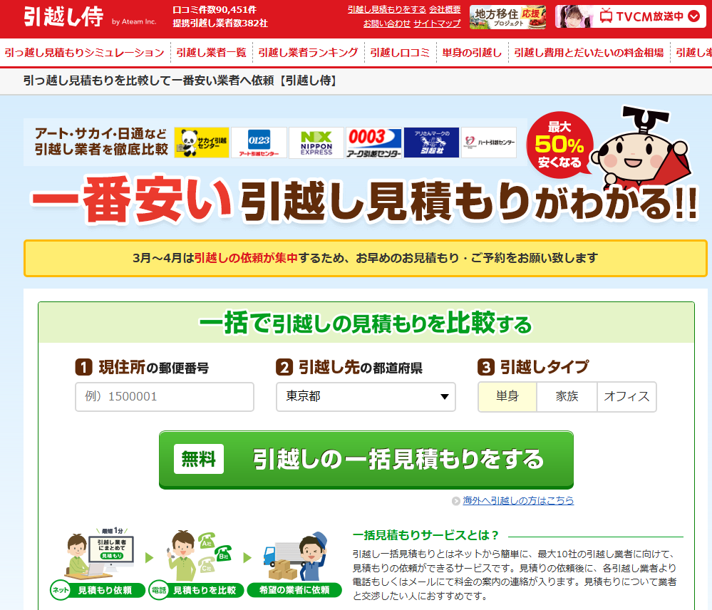 「引越し侍」は日本最大級の引っ越し見積もり比較サイトで、多くの業者と提携しているのが強みだよ💡